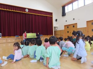 お誕生日会 先日、10月生まれのお誕生日会を行いました。真岡小学校卒業生のお母さん方のお話グループの方々が、紙芝居や絵本の読み聞かせに来てくださいました。子ども達も楽しそうに最後まで集中して聞いていました。