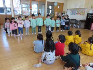 お話集会の様子です。今月は、りす・ひよこ組のみんなが可愛らしいお歌を披露してくれました。この1年間で心も体も大きく成長しましたね☆